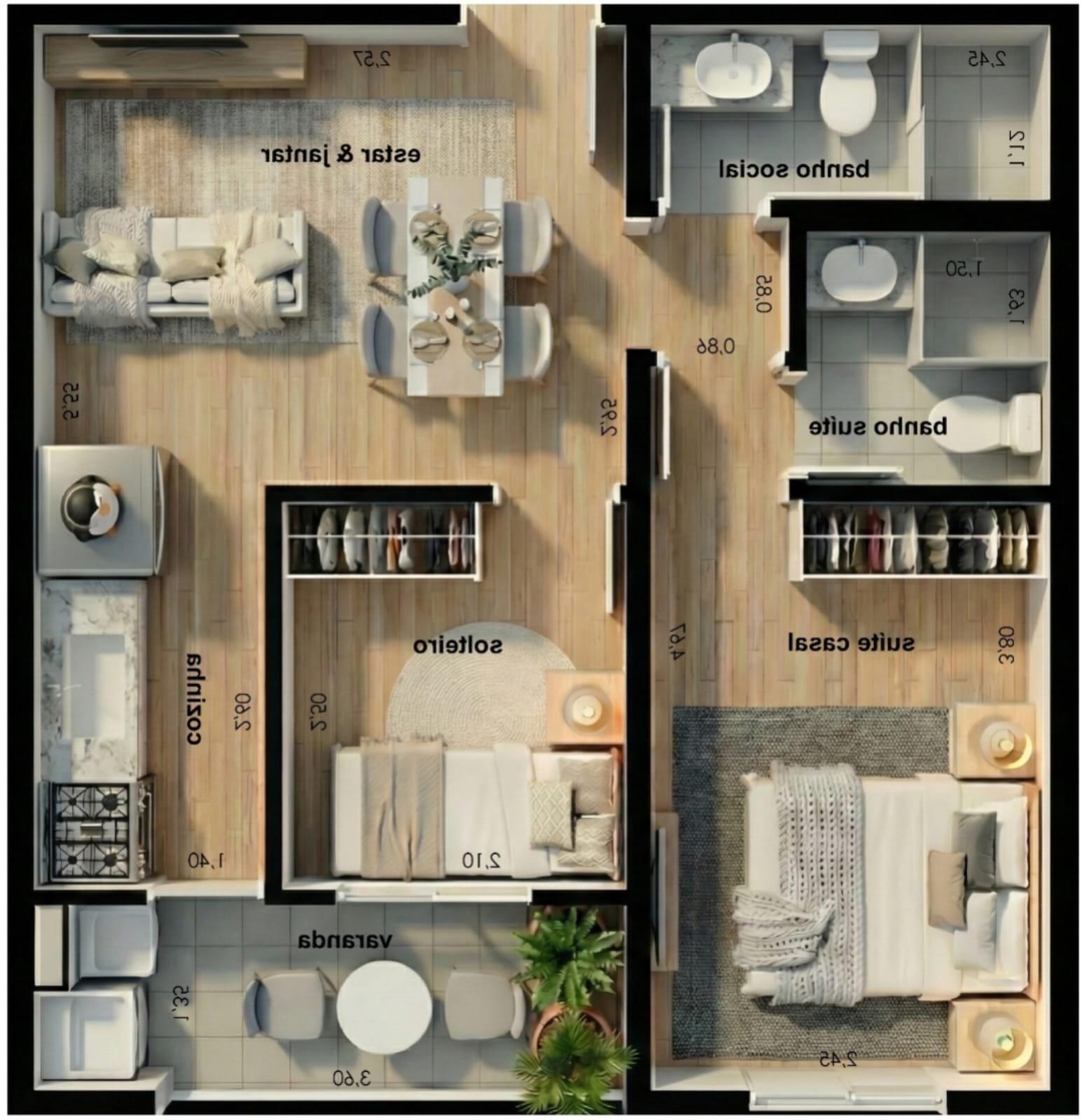 Planta Inteligente: 45m² de área útil otimizada, com 2 dormitórios (1 suíte) e varanda gourmet integrada — o layout favorito para locações via Airbnb e longa temporada.